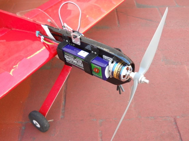 Una vez retirado el OS .40 y el tanque de combustible el motor eléctrico y la batería fueron “presentados” provisionalmente. Se puede observar el lastre transportado por la versión glow, que no hizo falta mantener al electrificarlo.